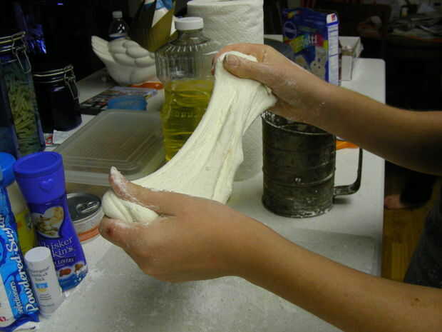 5. una vez es lo suficientemente gruesa como para no funcionar por todo el lugar, amasar mucho más difícil y que para masa de pan. Básicamente para amasar utilice la parte inferior de las palmas para empujar la masa hacia adelante y luego utilice sus dedos para retirarse al centro. Hacer esto una y otra otra vez aplicando más azúcar que lo empapa todo.