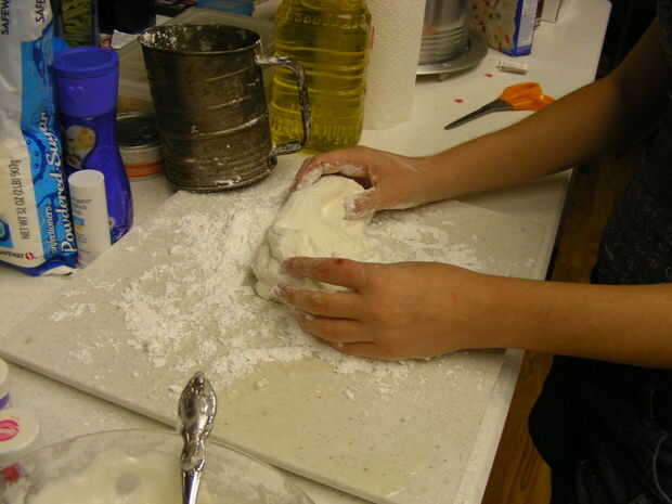 4. suavemente amasar el azúcar hasta que quede una consistencia más gruesa. maksuge a mantener bien cubierto en azúcar y mantener las manos bien engrasadas.