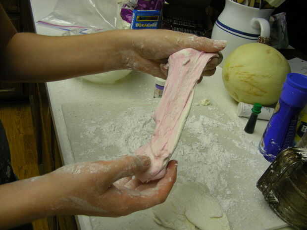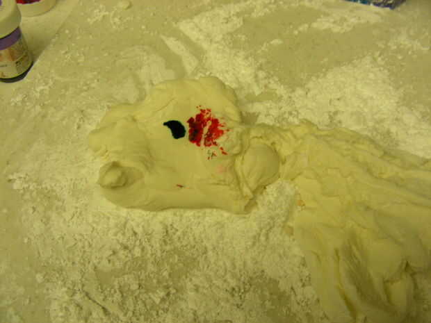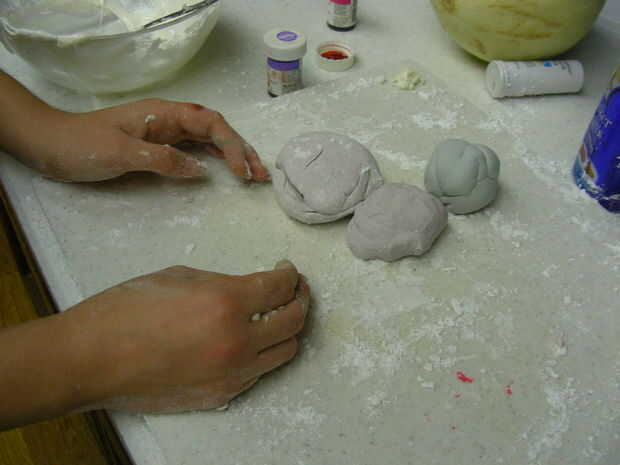 Separa el fondant en pequeño del tenis bola formas y luego rasgar con los dedos. Agregar partes iguales de verde y rosa para hacer un color realista del cerebro. amasar y mezclar el fondant hasta que los colores uniformemente la mezcla y se incorporan completamente. También se pueden hacer en algunas pilas tienen color de rosa más que verde y otros grises y más oscuro.