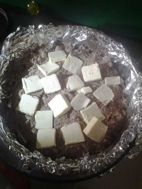 Trocear la mantequilla y capa en la parte superior la mezcla de pastel.