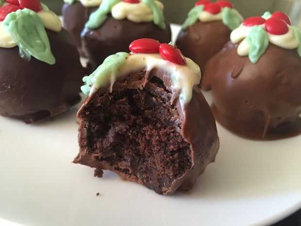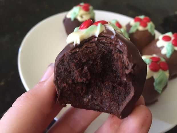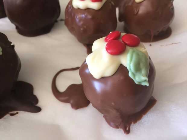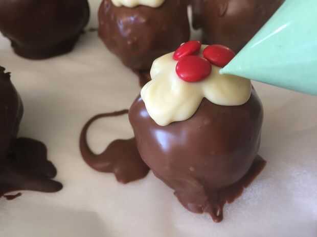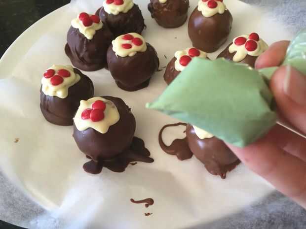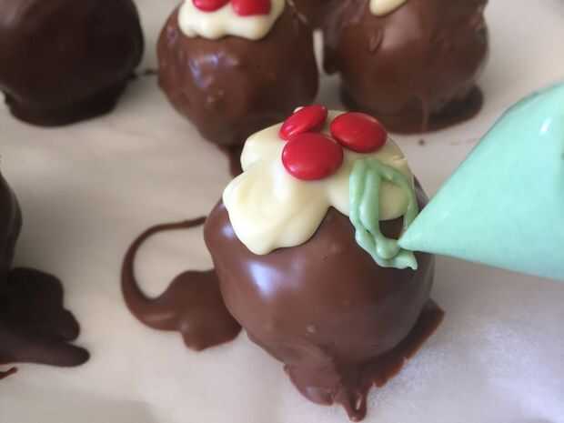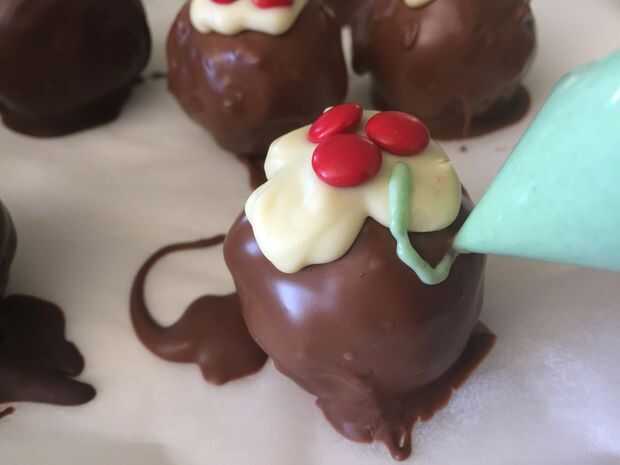 Cuando el chocolate blanco se ponga el verde chocolate en una manga pastelera y dibujar hojas de 2-3 alrededor de las bayas en la cima de las bolas. Luego coloque en la nevera hasta que se les sirva.