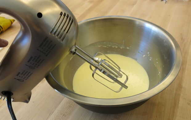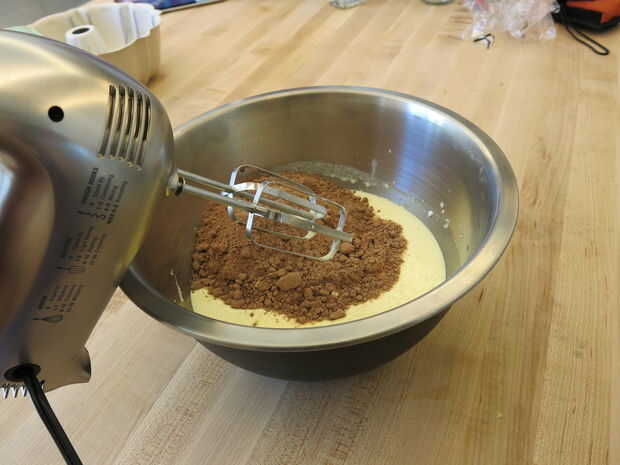 Mezclar el aceite, agua, crema agria y huevos en un tazón grande utilizando una mezcla de la mano. A continuación, agregue la mezcla de pastel y luego el pudín instantáneo. Una vez que la masa esté suave, añadir las virutas de chocolate.