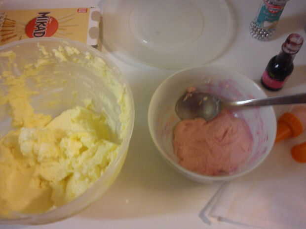 Pongan un poco de crema en el recipiente separado y añadido algunos alimentos rosa colorante a él (como tengo blanco con casos de Magdalena rosa quería la crema blanca y rosa a. Usted puede elegir cualquier otro color si quiere). Puse crema rosa en un lado de la Manga pastelera y llena el resto de crema blanca, por lo que salió de blanco con el toque de color de rosa.