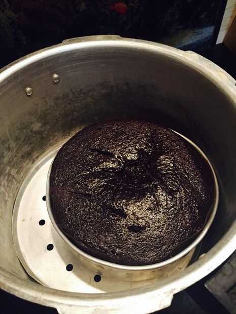 Coloque un recipiente de metal boca abajo de lado cualquier otra olla a presión (uno simple) y colocar el pastel encima. (esto ayuda a evitar el calor directo)