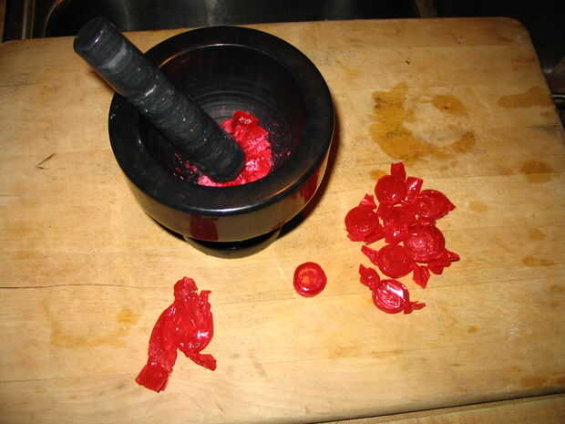 Mi vino favorito de pastel confeti es el caramelo de canela triturado en baño de vainilla. Aquí es donde se llega a utilizar el mortero y maja, a desenvolver y smash los discos Canelos a pequeños pedacitos/polvo y espolvorean por encima. La dulzura crujiente en la parte superior del pastel realmente complementa los dulces poco en el pastel. Si alguien sabe donde puedo conseguir los discos Canelos color verdes que serían mejores para la decoración como el siguiente: