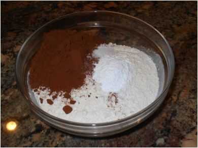 4. en un tazón mediano, mezcle el azúcar, harina, cacao, bicarbonato, polvo de hornear y sal.
