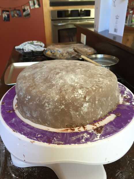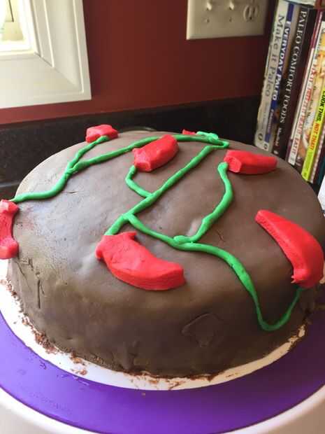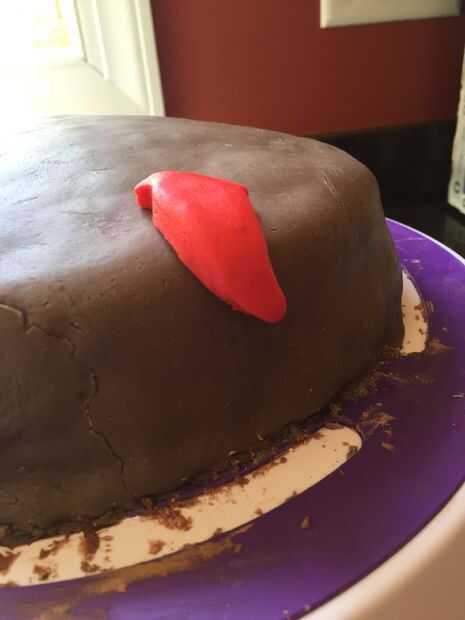 Bien ahora tiempo para la diversión. Vas a querer teñir el fondant en 3 colores una vez que ha enfriado por un tiempo. Primero una bola bastante pequeña de color verde (verde vine buscando color). Entonces quieres un poco más grande de una bola de color rojo (tipo de sangre roja). Entonces para la mayoría de la pasta de azúcar que desea marrón chocolate. (hacer un chocolate de color marrón es una mezcla de varios colores es fácil de hacer y si no en la parte posterior de su paquete de tinte usted puede fácilmente buscar.) Ahora quieres estirar o marrones pastillaje (fondant) primero en un gran rollo. Desea el fondant sobre un centímetro de grosor. No olvide usar un montón de azúcar sobre la superficie de trabajo o el fondant se pegue. Otro truco es poner el fondant entre envoltorios de plástico con sin azúcar y solo usar el plástico con ningún palo. Una vez tienes el fondant enrollado muy bien su tiempo para la parte superior de la torta de primera. Una vez que las heladas la parte superior colocar la segunda torta encima de la primera y luego helada todo. Ahora enrollar el fondant en el rodillo y llevarla a tu pastel y rodar hacia fuera sobre. (o sin embargo desea conseguir el fondant sobre el pastel). Ahora presione el pastillaje (fondant) apretado en la parte inferior de la torta y luego con cuidado cortar el fondant sobrante. Ahora si han pulverizado azúcar sobre el fondant y todo blanco puedes tomar una toalla de papel húmeda y limpie el exceso de azúcar. Una vez el fondant marrón puede salir tu fondant rojo. Puede rodar el rojo alrededor de la mitad de una pulgada de espesor. Me ha pasado que tienen un cortador de galletas de pimienta así usé pero se puede mano libre un ají. Distribuidos alrededor de 5 o 6 chiles en la torta. (un poco de agua en la parte inferior del fondant chilis aplicados con una brocha les ayudará a pegar y luego se puede colgar sobre los lados de la torta). Una vez que son bien allí puedes empezar a cortar piezas largas delgadas verde y rodando como una serpiente delgada. conectar múltiples rollos de verde junto y las puntas de los pimientos. (mirar foto para mejor ejemplo). ¡ Felicidades! Usted acaba de hacer un pastel increíble para impresionar a tus amigos. Espero que disfruten mi familia igual. Si te gusta esto realmente ayudaría a un voto. ¡Gracias!