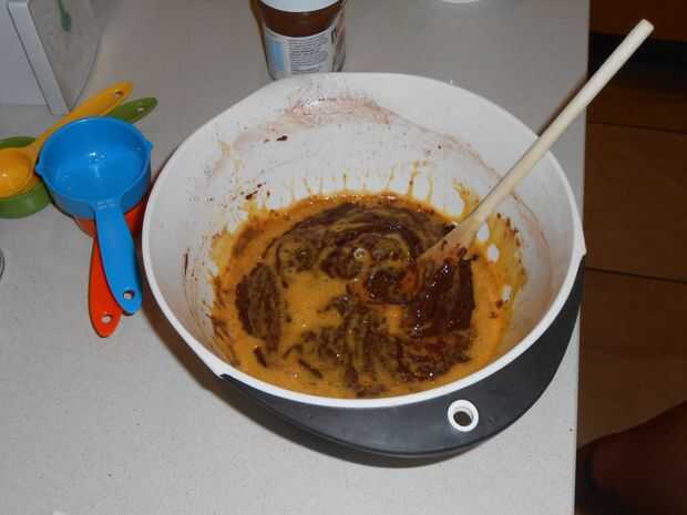9. Añadir un tercio de la mezcla de clara de huevo a la mezcla de harina y mezclar con una cuchara mezcladora.