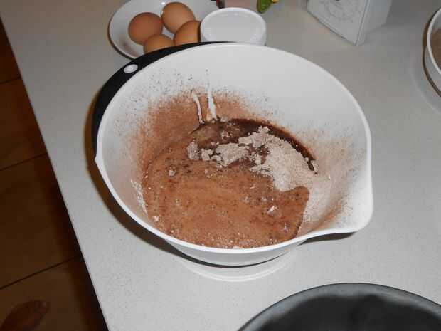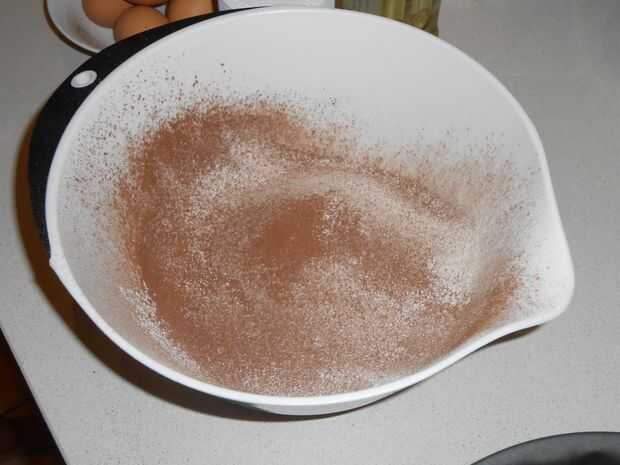 2. Coloque el tamiz sobre un bol, colocar la harina de pastel, azúcar, cacao y 20 ml de la levadura de 25 ml en el colador y tamizar en el Bol.