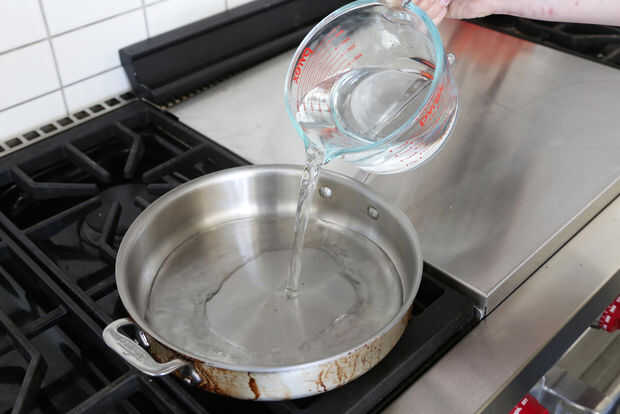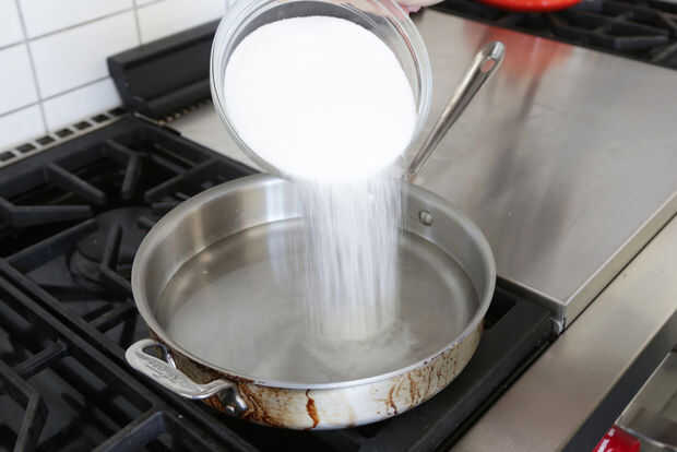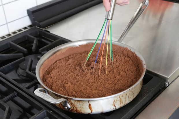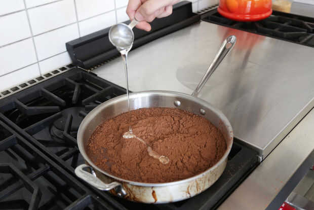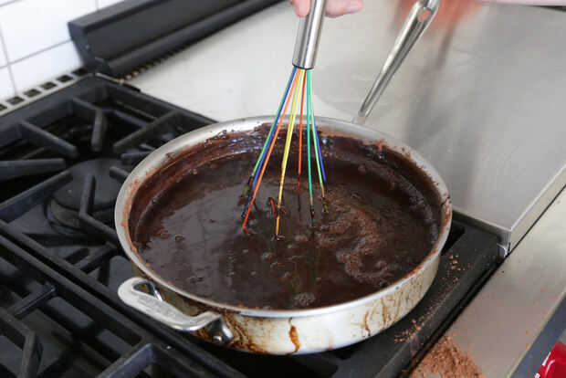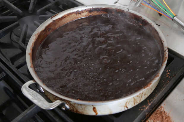 En una cacerola grande, mezcle 2-1/2 tazas de agua, el azúcar y el cacao en polvo.