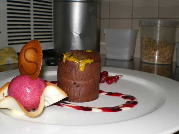 Pastel de chocolate oscuro con corazón líquido azafrán