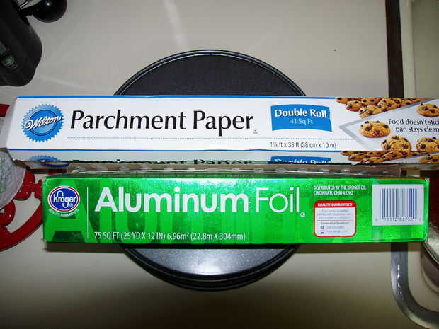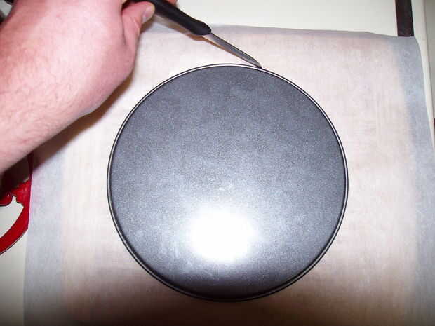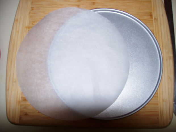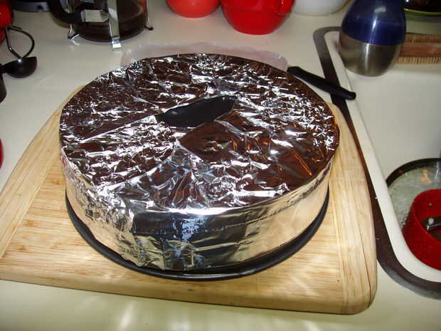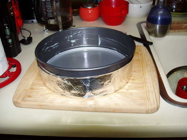 Prepare la asadera alineando la parte inferior con una pieza redonda de papel de pergamino. Hay una foto a continuación muestra un método para cortar un pergamino redondo para el fondo de la olla. Engrase los lados del molde con mantequilla y enrolle la parte inferior de la mitad de la bandeja (en el exterior) en al menos dos capas de papel de aluminio.