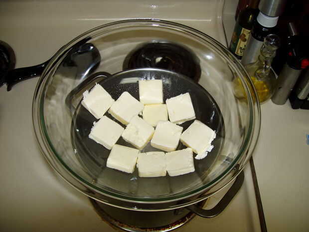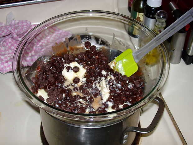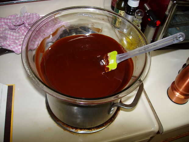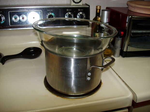 Mientras que los huevos se baten o tal vez después, coloque el tazón más grande, resistente al calor encima de la olla grande de agua no hirviendo . Ponga el chocolate y la mantequilla en el recipiente. Este arreglo se utiliza como un baño María para evitar daño por calor en el chocolate. Si tienes una caldera doble legítima, por todos los medios usar! Revuelva la mezcla suavemente y muy de vez en cuando como que se derrite. Su temperatura está entre 110 y 115 grados Fahrenheit. Asegúrese de revolver antes de tomar la temperatura y mantener la punta del termómetro de la parte inferior del recipiente. Una vez alcanzada la temperatura deseada, retire el tazón de fuente entero de la olla, colocarla sobre un posafuentes o cualquier otro elemento resistente al calor y apague el quemador de la estufa.