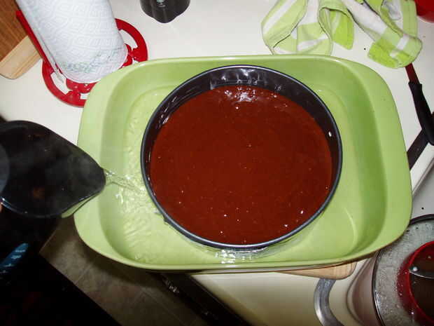Coloque la carga springform suavemente en la bandeja de plato/Asador/parrilla. Vierta el agua hirviendo en el recipiente, no el springform. Desea por lo menos una pulgada de agua en el plato. Esto se llama un baño de agua (o al baño María) y comúnmente se utiliza en la hornada.