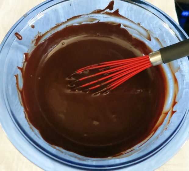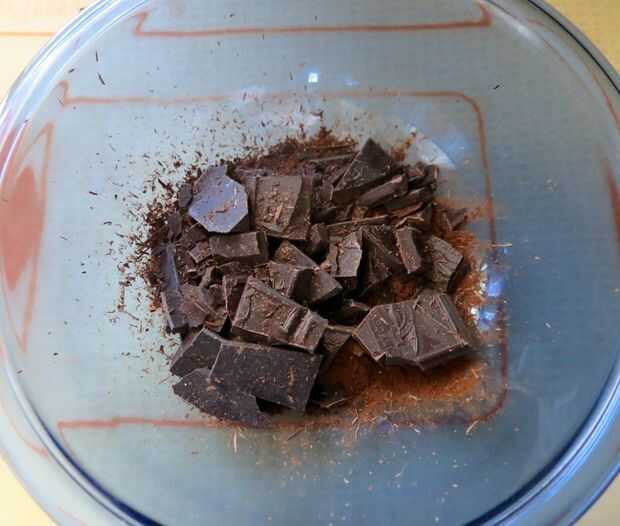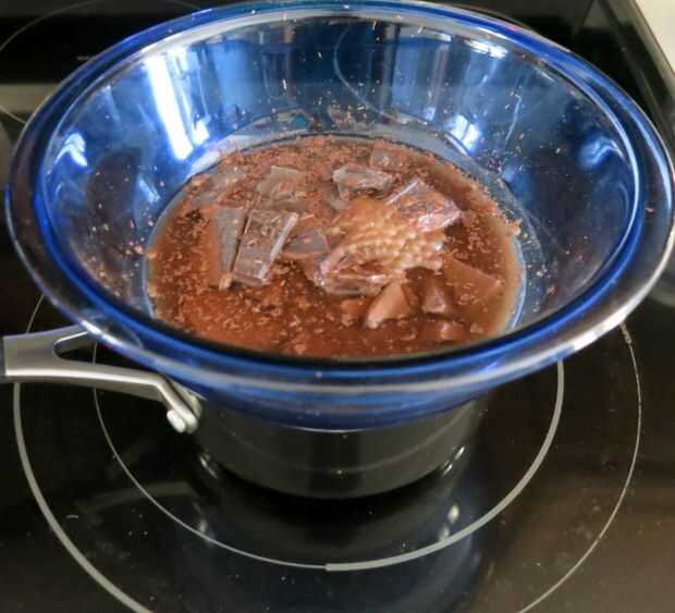 Combinar chocolate, cacao en polvo y agua caliente en un tazón mediano resistente al calor; Set bol sobre una cacerola que contenga 1 pulgada de agua hirviendo y revolver con espátula de goma hasta que el chocolate se haya derretido, aproximadamente 2 minutos. Añadir 1/2 taza de azúcar a la mezcla de chocolate y remover hasta que espesa y brillantes, de 1 a 2 minutos. Retire el recipiente del fuego y dejar de lado que se enfríe.