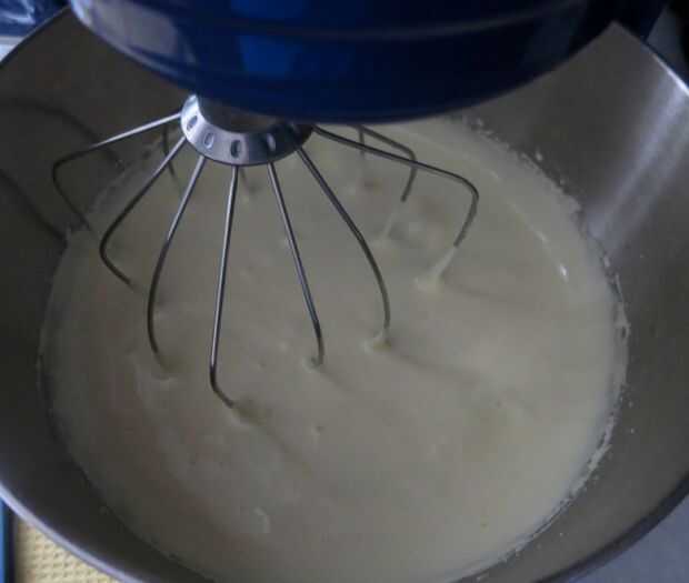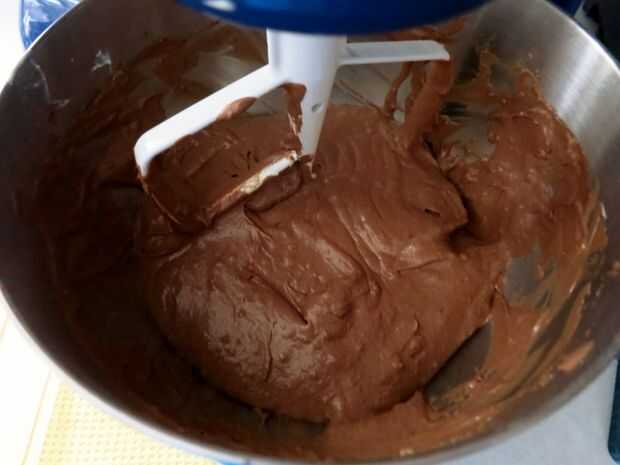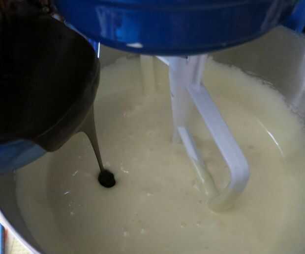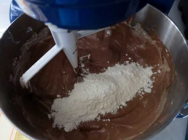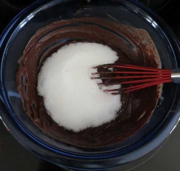 Agregue la mezcla de chocolate frío para la mezcla de huevo/azúcar y mezclar a velocidad media hasta bien incorporado, 30 a 45 segundos, haciendo una pausa para que rebañe las paredes del tazón con una espátula de goma según sea necesario.