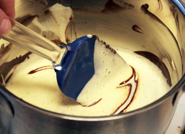 Doblar lentamente la mezcla de huevo en el chocolate.  Resistirá al principio de la cooperación.  Pagará su persistencia y finalmente tendrás un relleno muy bien incorporado.