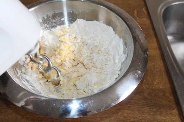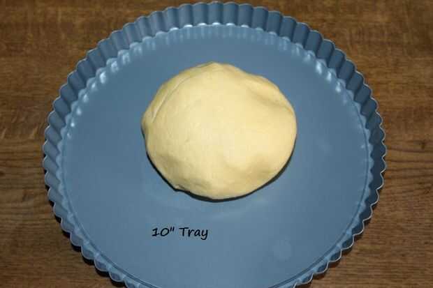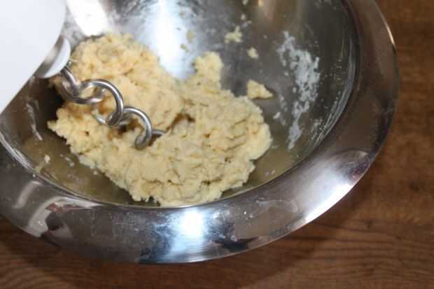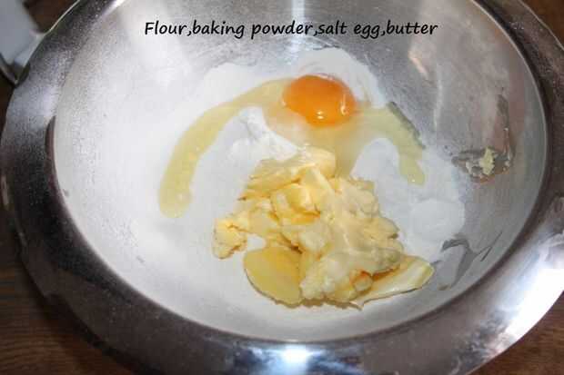 Para hacer la masa mezcle juntos la harina y polvo de hornear. Tamice en a un tazón y agregue los otros ingredientes. Mezclar con una batidora con gancho amasador, primero brevemente en la posición más baja, luego en la posición más alta hasta que la masa se forma. Luego rodar en una bola con la mano. Coloque a un lado.