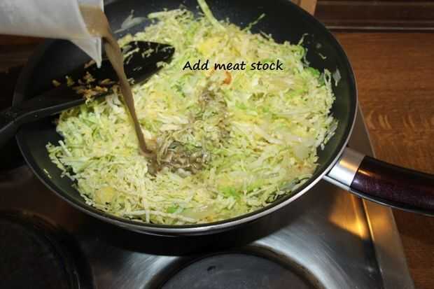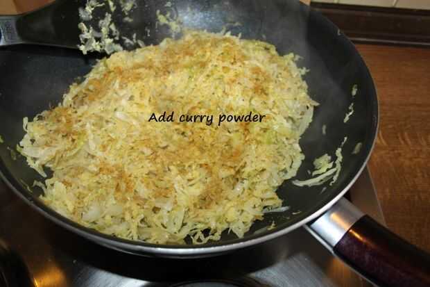 Añadir la cobertura de existencias, col y la carne y rehogar por unos 15 a 20 minutos revolviendo de vez en cuando. Finalmente Sazone con curry en polvo, sal y pimienta. Dejar la col que se enfríe un poco.