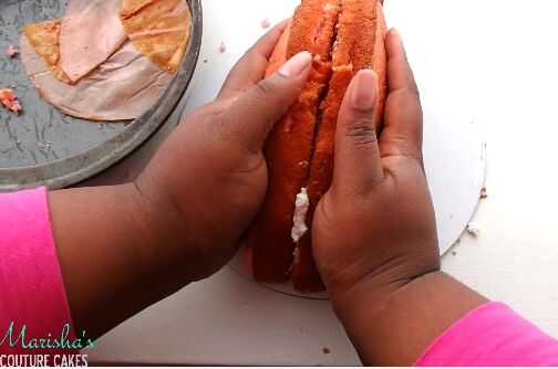 Asegúrese de que el pastel está completamente enfriado y ha sido refrigerado o congelado. Esto ayudará a evitar la rotura como se ve en la foto.