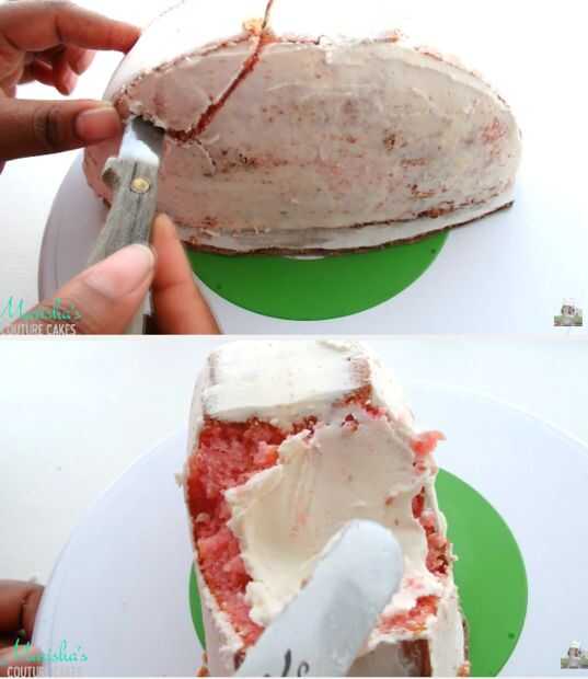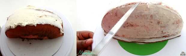 A continuación, con un cuchillo corta una muesca pequeña hacia el lado izquierdo del centro. Se trata de la parte posterior de la cabeza del conejo. Ver foto o video tutorial para el lugar adecuado para cortar. Guarde el pastel quitado y aplique una capa delgada de escarcha sobre la sección recién cortada. Congelar durante 10 minutos.