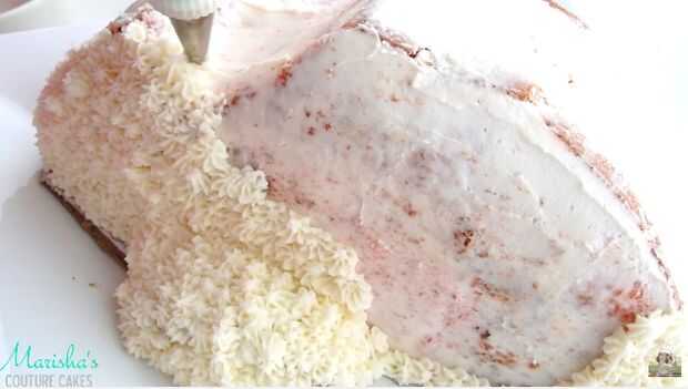 A continuación, tome el pedazo de pastel que fue quitado de la capa y dividir las dos mitades de modo que hay dos piezas. Coloque estos (redondo hacia arriba) hacia la parte delantera de la parte inferior debajo de la muesca cortada. Heladas las piernas y seguir estrellas tubo todo el pastel hasta que ha cubierto toda la superficie.