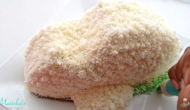 Una vez el conejo es plenamente cubierto de deliciosa helar la piel, rellenar una manga pastelera con helar y uso Wilton punta verde #233 o cualquier otra tubería de hierba/piel de la punta. Hierba de pipa alrededor de toda la circunferencia de la torta.
