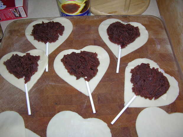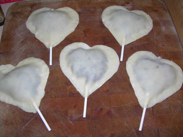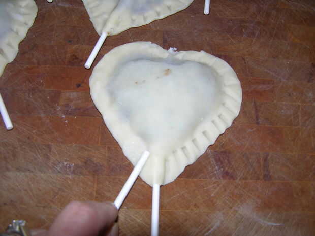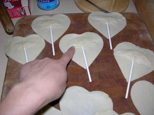 Presione suavemente palos en corteza. Para mayor seguridad, puede utilizar un trozo de corteza para cubrir el palo. Añadir un pequeño o grande (cualquiera su preferencia) terrón de relleno al centro. Mojar la yema del dedo en un recipiente con agua, mojar los bordes de la corteza del corazón por lo que el agua pega las dos conchas juntos. Junte los bordes firmemente. Utilizando el extremo de un palo de Chupa-Chups, doble los bordes.
