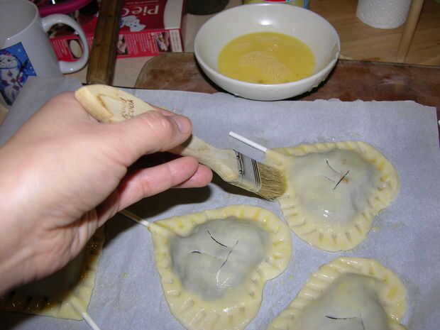 Romper el huevo en un tazón y mezcle bien. Cepille todo el exterior del pie o zonas que quieras ser más oscuro cuando se cocina.