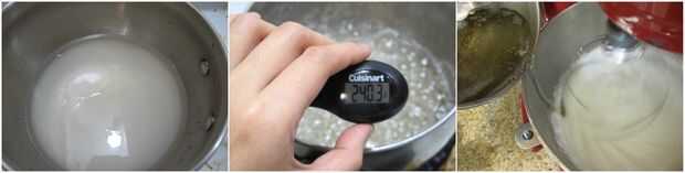 En una olla, poner el azúcar y el agua en él. Calentar a ebullición y hasta llegar a 240° F. Tomar directamente en el bol y mientras que para batir lentamente Vierta el almíbar en el recipiente y continuar a batir a velocidad alta.