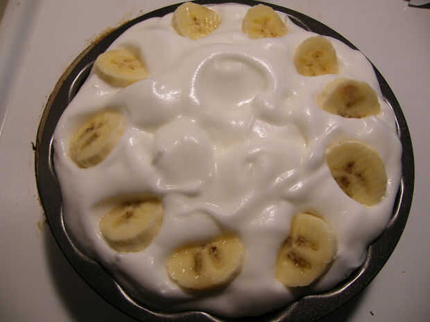 Bata las claras de huevo y jugo de limón en un tazón grande con batidora eléctrica hasta una espuma firme. Poco a poco batir azúcar, 1 cucharada a la vez, hasta que el azúcar se disuelva y tieso. Pila encima de sellado a los bordes del pie. Cueza al horno en 350 F por 10 minutos máximo (color dorado). Como se puede ver, decoré mi pastel con más rodajas de banana (1 banana).