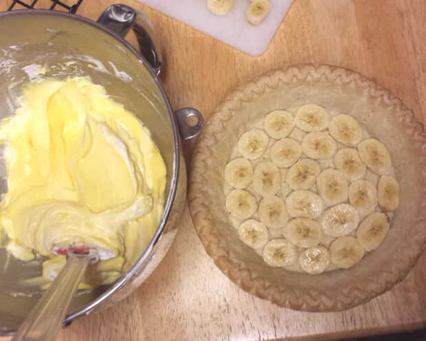 Añadir la empanada relleno a la masa con las rodajas de plátano y difundirla nuestra por lo que se distribuye uniformemente alrededor de la bandeja, cortar algunas rodajas de banana más para la parte superior.