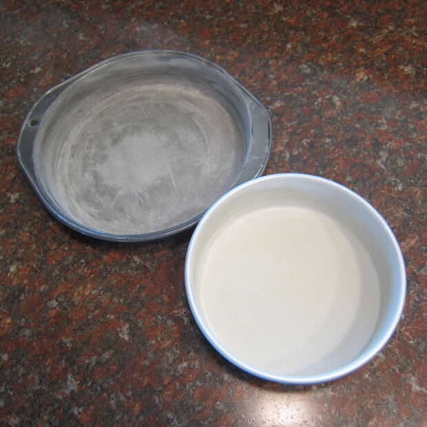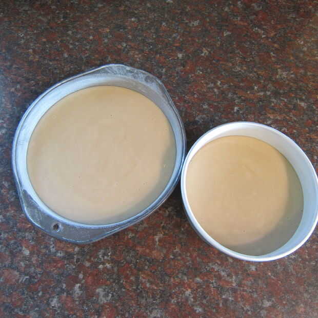 PRECALIENTA el horno a 350 grados F. engrasa y Enharina dos moldes. Utilicé una sartén de 6 pulgadas y una de ocho pulgadas de pan ya que estoy haciendo una torta con gradas.