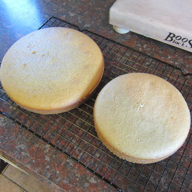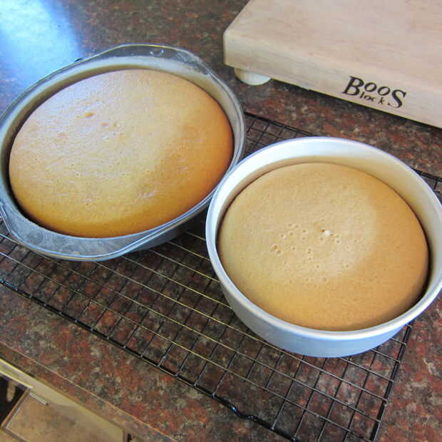 Si vas a hacer un pastel en niveles como se muestra en la intro repetir este proceso otra vez para que tengas 2 pasteles de 6 pulgadas y 2 pasteles de ocho pulgadas. Si tienes 2 bandejas de 6 pulgadas y 2 cacerolas de ocho pulgadas sólo doble la receta anterior y hornear pasteles de todos al mismo tiempo. No tengo esta de lujo.