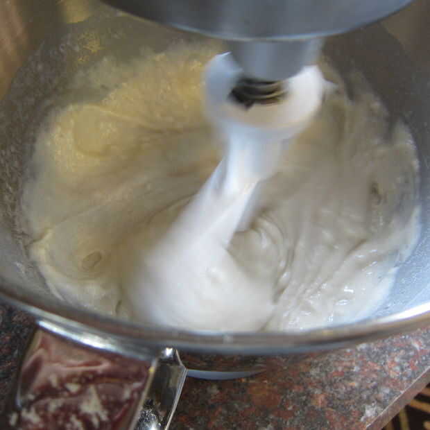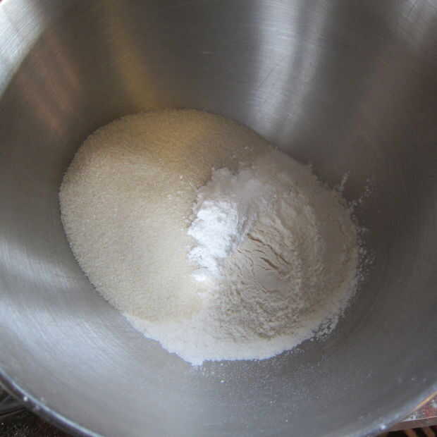 En el recipiente de una batidora con accesorio de pala, agregar harina, azúcar y bicarbonato de sodio. Mezclar brevemente en baja para mezclar los ingredientes secos. Lentamente agregue soda mientras la batidora está funcionando. Una vez todo está mojado (para que la harina no vuela para arriba en su cara!) Encienda el mezclador mediano y dejar que se ejecute durante 2 minutos, raspando hacia abajo lados según sea necesario. Sé que esto parece mucho tiempo pero quiere asegurarse de que todo se mezcla bien. Mezcla será muy caldoso.