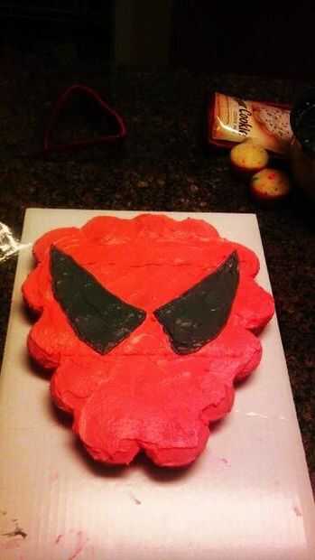 Con una espátula, repartidas glaseado rojo (cualquier marca que usted elija) los cupcakes les alisar cuidadosamente y suavemente para que cualquiera de los cupcakes no desmoronarse. Una vez helado, utilizar un cuchillo de mantequilla para limpiar los bordes de la cabeza de "Spider-Man".  A continuación, dibujar en los ojos de "Spider-Man" usando el gel de baño negro. Los ojos se pueden dibujar como una letra inclinada hacia atrás y hacia adelante "D"