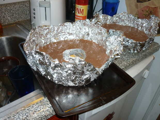 Hornear cada capa por separado en el centro del horno por lo que cuece uniformemente. Para el tiempo de cocción, sigue las instrucciones para un pastel de seno (alrededor de 45 minutos). Una vez hecho el pastel (palillo de dientes salga limpio al insertar en el pastel), quitarla y dejar a enfriar unos minutos antes de intentar separarlo del molde. Mientras que la capa de segundo (o solamente) está horneando pasemos al paso cinco para hacer el glaseado!