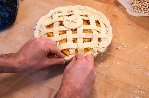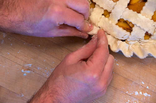 Para prensar la corteza, puede usar los dientes de un tenedor, prensado en el labio doblado ligeramente todo el camino alrededor de la tarta, o formar un borde festonado. Para formar el borde festoneado, use el pulgar y el dedo índice en su mano izquierda pellizcar un poco del labio doblado y el pulgar y el dedo índice en su mano derecha para pellizcar el labio al lado donde está pellizcando con su mano izquierda. Sólo tiene que pulsar en un poco con el pulgar de la mano derecha para hacer una marca (ver la segunda foto). Repetir todo el camino alrededor de la tarta.