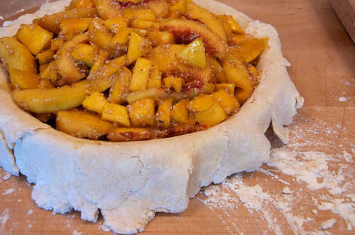 Remover la mezcla de especias de mango melocotón bien, para conseguir las especias bien combinadas con la fruta y vierta el lío todo en la corteza. Use sus manos para apretar la fruta y hacer tan pequeño como usted cualquier bolsas de aire en el llenado puede (la fruta se pondrá un poco más pequeña como cocina ya, y dejando muchas bolsas de aire puede resultar en una brecha muy grande entre el relleno y la corteza superior.)