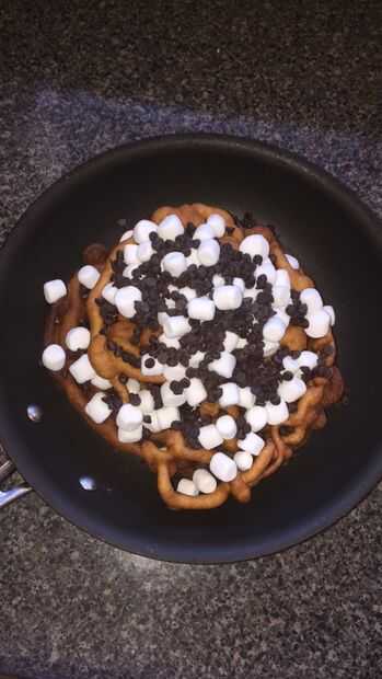 En una bandeja segura, capas tu pastel de embudo, malvaviscos y chips de chocolate. Colóquelo en el horno y asar durante 2-3 minutos (veces pueden variar según el horno). Cuando haya terminado, lo saca del horno cuidadosamente. Luego servir y disfrutar.