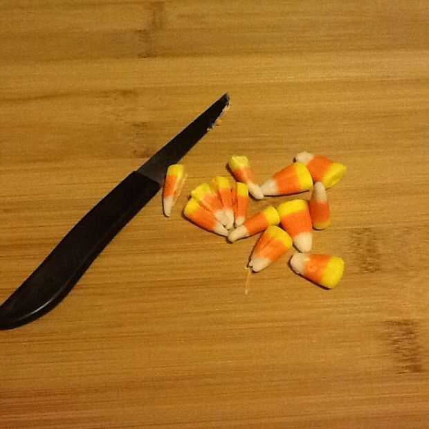 1. con un cuchillo afilado, cortar dulces maíz por la mitad longitudinalmente. Me pareció la manera más fácil de hacer esto para evitar la rotura por presionando la punta del cuchillo en el centro del caramelo y presionar rápidamente.