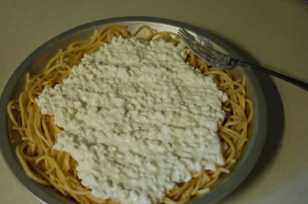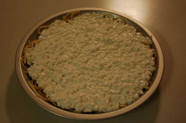 Así que tomar un tenedor o una cuchara y agregar una capa un poco gruesa de queso cottage en la parte superior de tus fideos. Suave a medida que agrega hasta completamente han cubierto la parte superior de los fideos. Si eres un poco brumoso en cuánto queso a utilizar, que tenía una tina de 16 oz de queso cottage y sólo 2 cuchara completos quedaron cuando terminé poniendo la capa de la tarta. Así debe dar una idea.