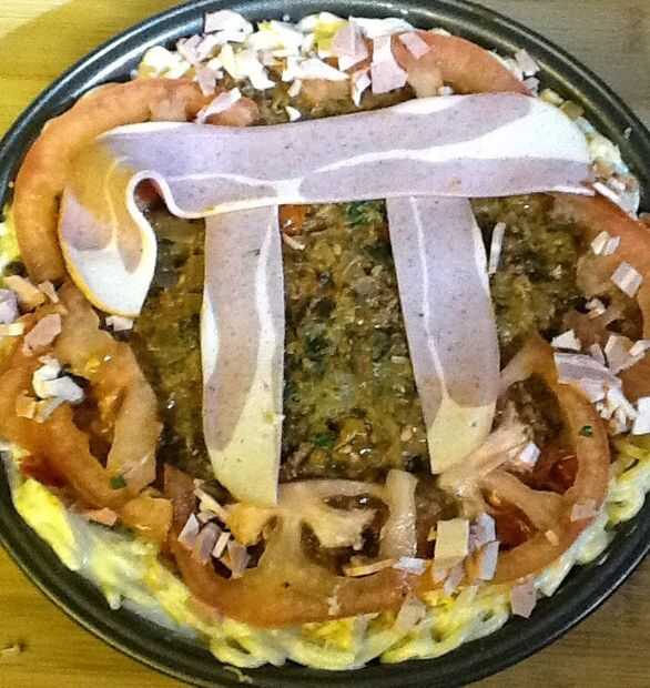 Para acabarla apagado, en estilo propio día Pi/e, utilicé unas tiras de tocino de pavo para hacer el símbolo de Pi en el centro.