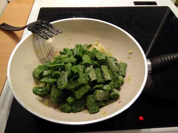 Añadir las espinacas a la cebolla, que debería haber recibido más suave ahora. No hay ningún problema si la espinaca todavía está congelada. Dejar derretir y revolver de vez en cuando. Usted se hará cuando la espinaca está totalmente desbloqueada y la mezcla es uniforme. Luego debe retirar del fuego.