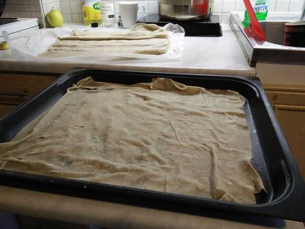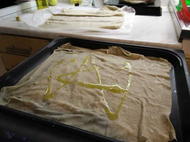 Empezar por aceitar la cacerola o el formulario, en el cual se cuece al horno la empanada. Luego coloque cada capa por separado y no te olvides de añadir aceite entre ellos. Puede utilizar las manos o un cepillo para distribuir el aceite uniformemente. He escuchado el aceite más que puesto, el "pesado" pero crujiente el filo las capas se convierten.