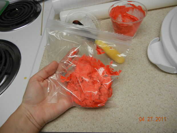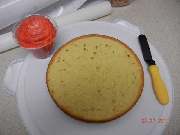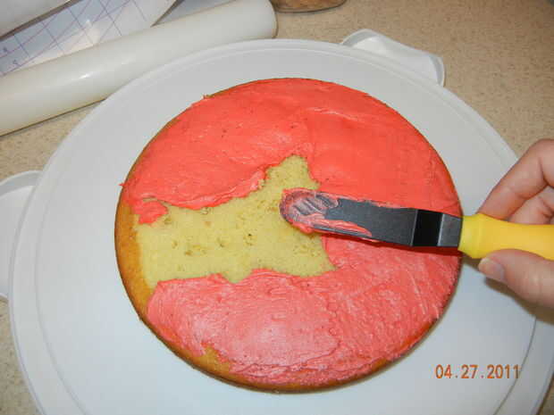 A partir del rojo glaseado me capa la parte superior de la parte inferior 8" Pastel Redondo. Usted puede poner como mucho o como poco helar como usted tiene gusto. Me gusta difundir una pequeña porción para cubrir la torta expuesta y entonces la pipa en helar más de relleno.