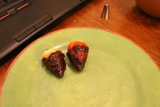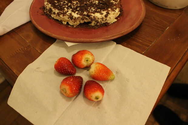 Vamos a añadir algunas fresas para la decoración. Limpiar cinco fresas y ponerlos en la mesa de secado. Las fresas de chocolate y baño de fusión en él. Poner las fresas sobre el pastel y la decoración bolsa para hacer líneas en las fresas y también el pequeño corazón en el lado.
