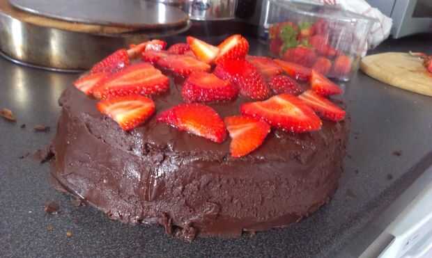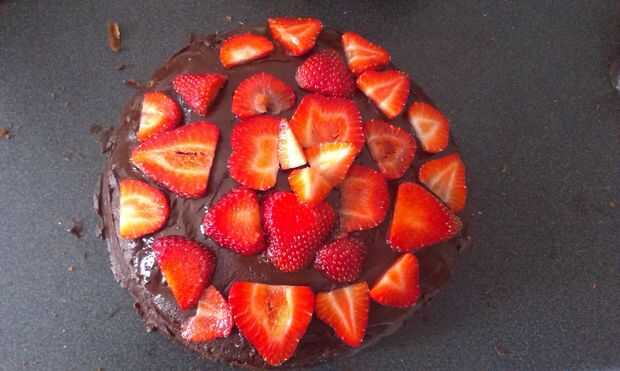 pongo algunas fresas en mi torta porque utilicé chocolate negro y necesitaba algo dulce para cortar a través de la amargura. Me gusta la combinación de chocolate negro y fresas pero he hecho este pastel con chocolate para el glaseado blanco y chocolate negro en lugar de fresas. Realmente puede usar cualquier chocolate elija y ponga nada en la parte superior que se desea.