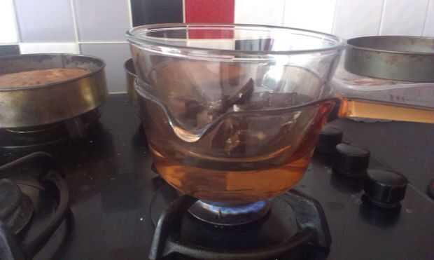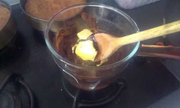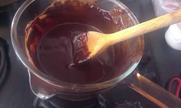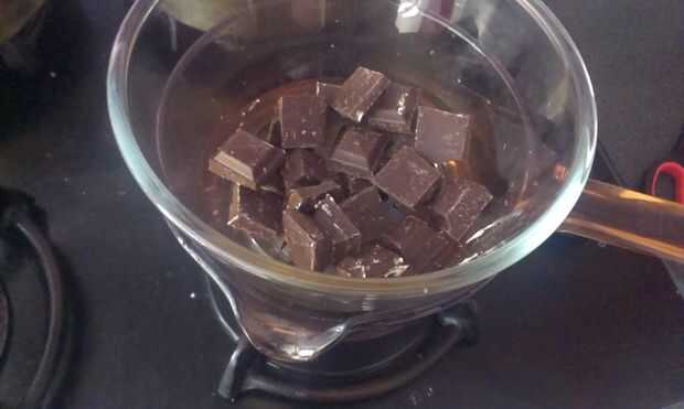 Se necesita colocar un recipiente de agua en la estufa y esperar hasta que empiece a hervir. Luego colocas una taza de chocolate en la cacerola de agua y esto hará que el derretir chocolate. Cuando el chocolate comenzó a derretirse, añadir mantequilla. Cuando ha comenzado la mantequilla a derretir, añadir unas cucharas de mesa de la leche.