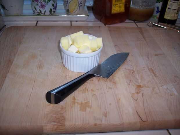 Congelar toda la mantequilla. Cortar en cubos de 1/2" y mantener refrigerado.